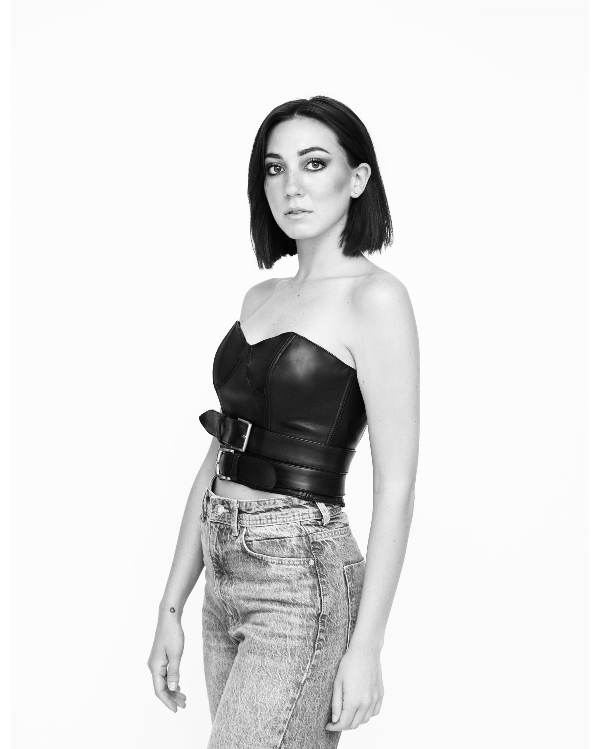 bustino crop-top di produzione artigianale in pelle di vitello pieno fiore, steccato, foderato, scollo a semi-cuore, mezze finte coppe, due cinture decorative già regolate per taglia con fibbie in nichel free e passanti, asoline su fodera interna, spalline sganciabili regolabili, chiusura con zip metallica sul retro
