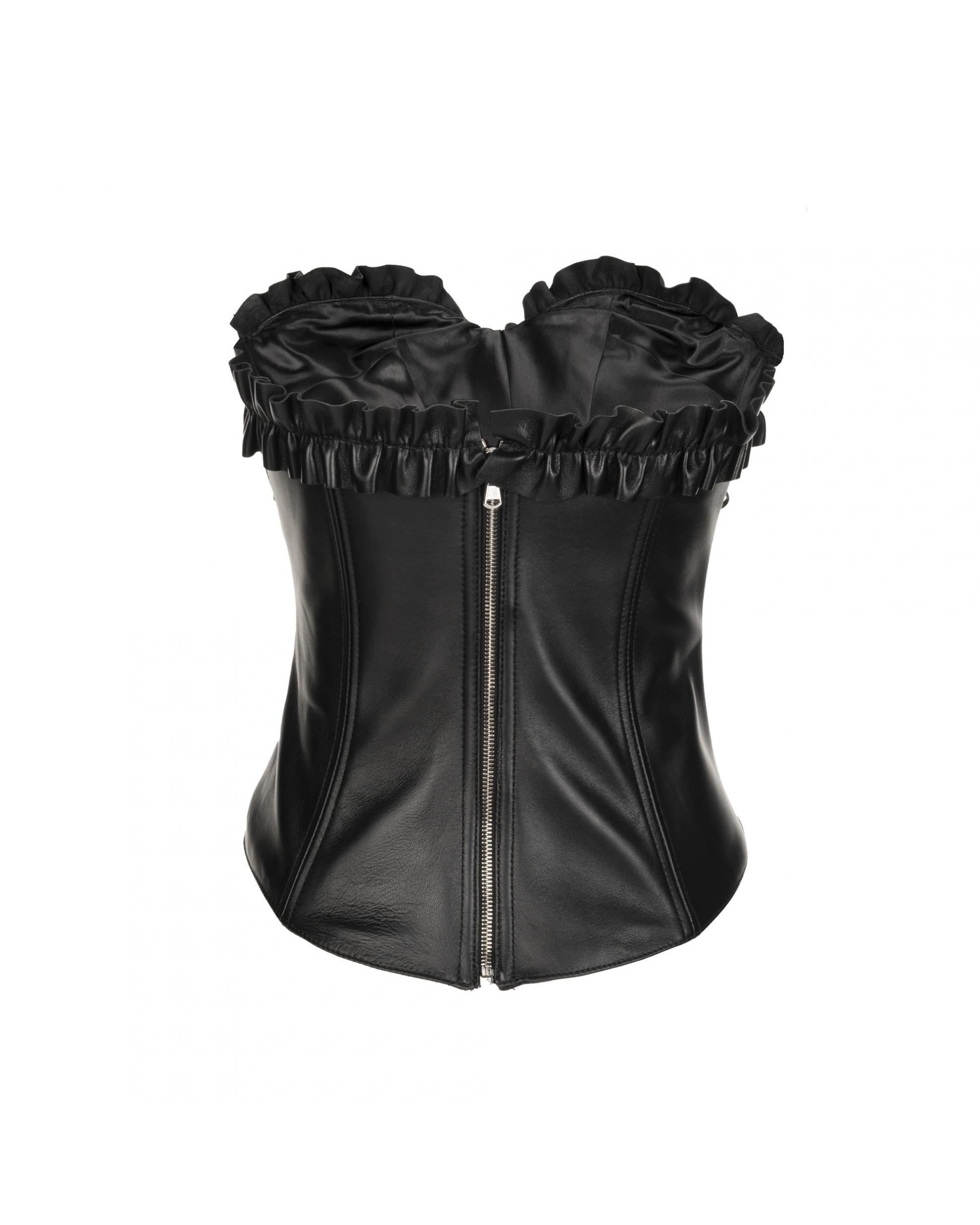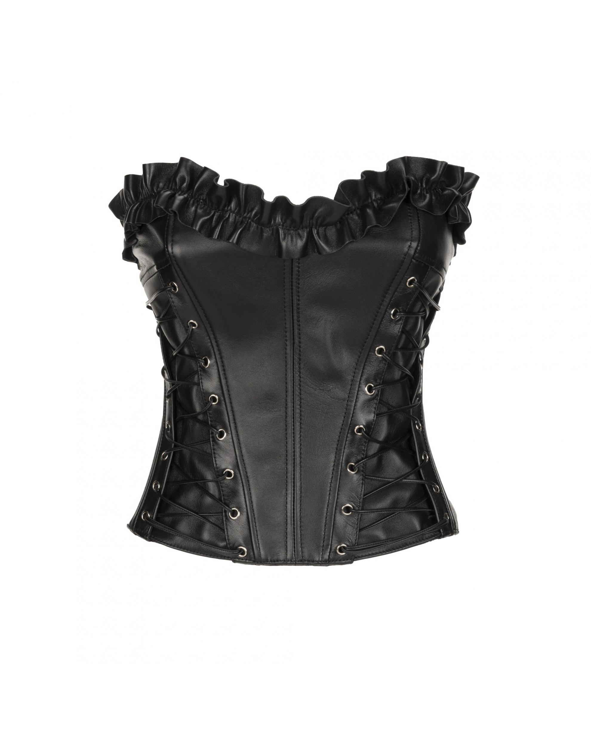 bustino steccato in vera pelle con rouches sullo scollo, occhielli e laccetti