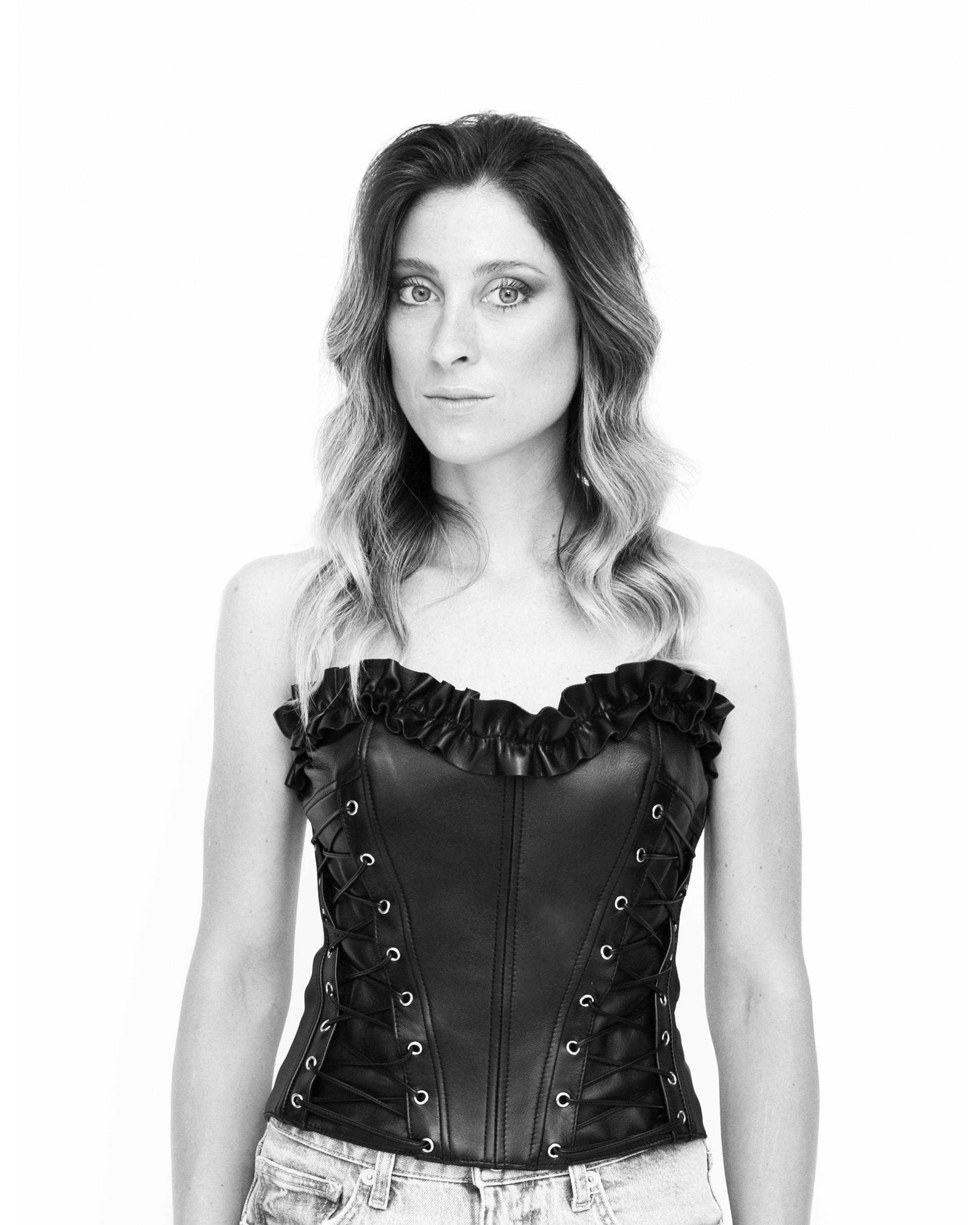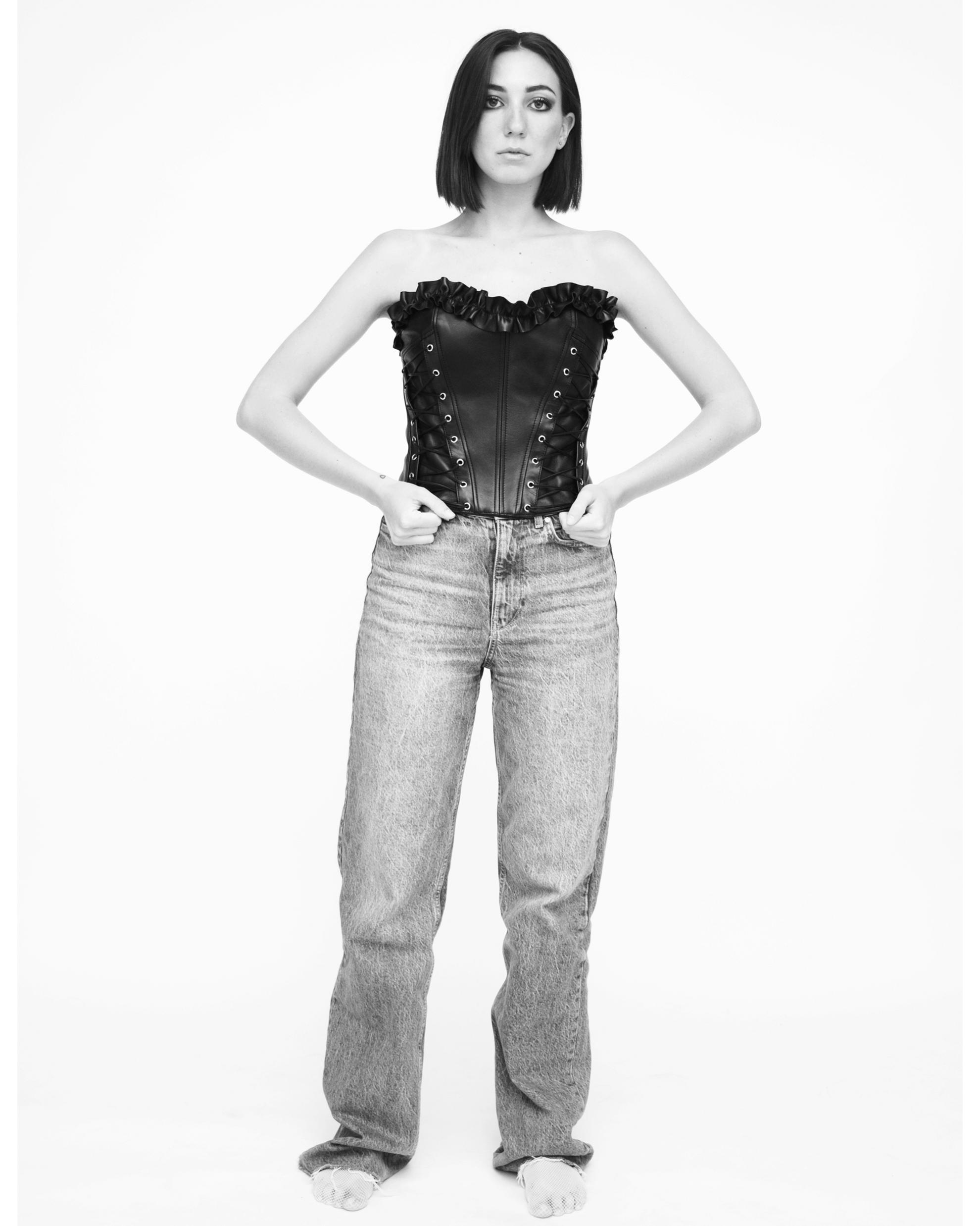 bustino di produzione artigianale in pelle di vitello pieno fiore, steccato, foderato, rouches sullo scollo, occhielli in nichel free e laccetti in vera pelle già regolati per taglia, asoline su fodera interna, spalline sganciabili regolabili, chiusura con zip metallica sul retro